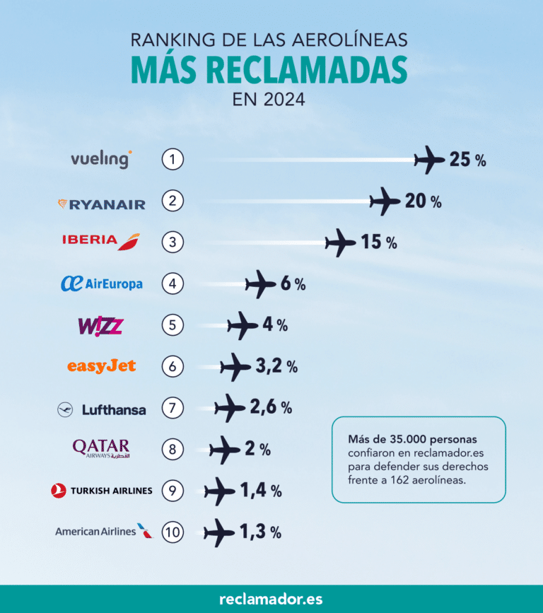 A lo largo del año 2024, el portal reclamador.es ha registrado más de 35.000 reclamaciones relacionadas con incidencias en vuelos de 162 aerolíneas. Entre estas, Vueling se posiciona como la aerolínea más reclamadas, acumulando el 25% de las quejas, seguida de Ryanair con un 20%. Iberia se mantiene en la tercera posición con un 15% de las reclamaciones, lo que indica que estas tres compañías dominan el tráfico aéreo en España y, con ello, las incidencias asociadas.