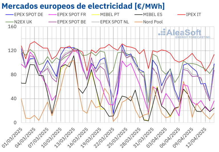 En la segunda semana de abril, los precios de los mercados eléctricos europeos se mantuvieron estables, con promedios semanales ligeramente superiores a los de la semana anterior. Este comportamiento se atribuye principalmente al descenso en la producción eólica, mientras que, de manera contraria, la producción solar fotovoltaica aumentó significativamente, alcanzando récords históricos en Francia e Italia. Además, los futuros de Brent, gas y CO2 experimentaron sus precios de cierre más bajos desde abril de 2021, septiembre de 2024 y abril de 2024, respectivamente.