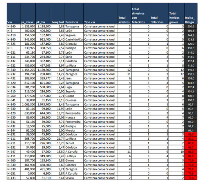 Entre los datos más preocupantes, las carreteras convencionales siguen siendo las más peligrosas, con un riesgo cuatro veces mayor de siniestralidad en comparación con las vías de alta capacidad. Sin embargo, lo alarmante es que, por primera vez en más de una década, el riesgo de siniestro en autopistas y autovías también ha aumentado. El informe destaca que hay 103 carreteras con al menos un tramo clasificado como rojo o negro en términos de peligrosidad; de estas, 15 vías concentran más de la mitad de los segmentos riesgosos.