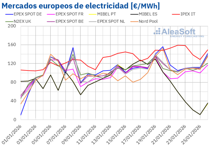 Las temperaturas medias en Europa descendieron, con Alemania experimentando la mayor caída, de 4,8 °C. Para la semana del 26 de enero, se anticipa un aumento en la demanda eléctrica en mercados como Gran Bretaña, Francia, Portugal, Bélgica e Italia, mientras que en Alemania y España se espera una disminución.