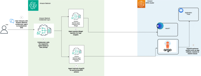 Durante el evento AWS re:Invent 2024, Amazon presentó una innovadora capacidad de colaboración multi-agente a través de Amazon Bedrock, actualmente en fase de vista previa. Esta funcionalidad permite desarrollar y gestionar múltiples agentes de inteligencia artificial que trabajan en conjunto en tareas complejas que requieren habilidades especializadas. Dentro del contexto de la resolución de problemas en clústeres EKS, un flujo de trabajo multi-agente facilitaría la gestión, permitiendo que un agente de gestión de flujo de trabajo se integre con otros agentes que interactúan con señales de observabilidad y con un pipeline de integración y entrega continua (CI/CD).