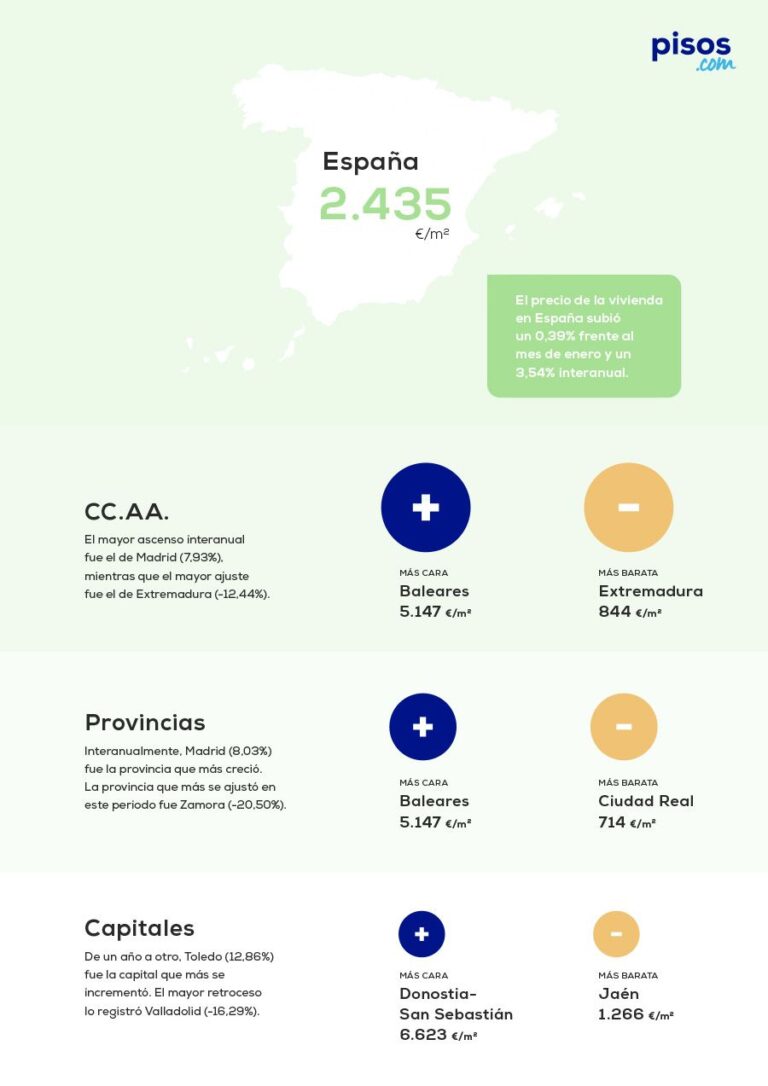 Desde un punto de vista regional, Baleares se posicionó como la comunidad más cara en febrero, con un precio medio de 5.147 euros por metro cuadrado, seguida de Madrid con 4.571 euros y el País Vasco a 3.309 euros. Por el contrario, Extremadura, Castilla-La Mancha y Castilla y León fueron las regiones con precios más bajos, con 844, 956 y 1.239 euros por metro cuadrado, respectivamente. En términos interanuales, Madrid destacó con un aumento del 7,93%, mientras que Extremadura experimentó la mayor caída, del 12,44%.