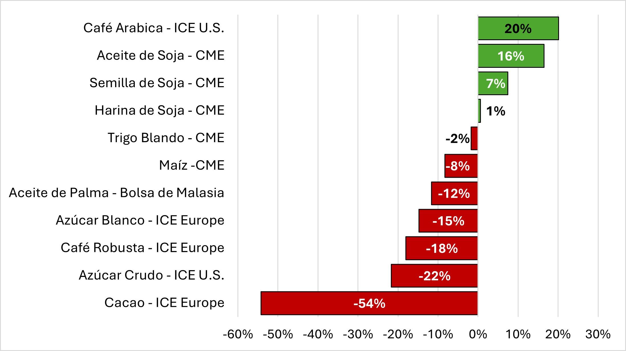 Por otro lado, el complejo de la soja también se ubicó en terreno positivo, aunque con situaciones diferentes. Este crecimiento fue impulsado en gran medida por el aceite de soja, beneficiándose de la demanda energética que ha sostenido el interés por los aceites vegetales, incluso en un contexto de buena disponibilidad agrícola global. Sin embargo, el grano de soja solo logró una mejora parcial, y la harina de soja mantuvo una estabilidad interanual afectada por una menor dinámica en la demanda ganadera y un excedente estructural en la oferta.