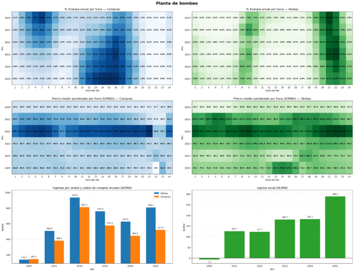 En la distribución horaria de la energía comprada y vendida por la planta, se observa que la mayor concentración de energía en compras se presenta durante la madrugada, cuando la demanda es reducida y los precios son bajos. En 2020 y 2021, alrededor del 10,6% y 8,5% de la energía anual se compraba a las 05:00 horas, mientras que a partir de 2022, se identifica un desplazamiento hacia las horas centrales de la tarde, con picos que alcanzan hasta el 11,3% en 2025. Este cambio refleja una focalización en horas de mayor insolación, donde el crecimiento de la energía solar fotovoltaica ha impactado directamente los precios.