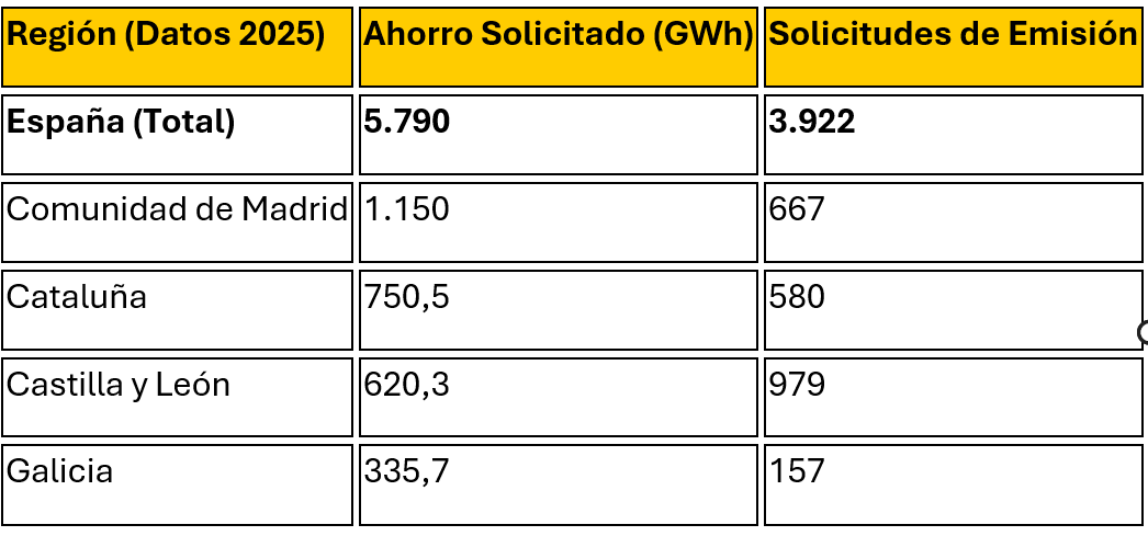 Las comunidades autónomas que más solicitudes han realizado son Madrid y Cataluña, destacándose en el ranking nacional. En la Comunidad de Madrid se solicitaron 1.150 GWh en 2025, un aumento considerable respecto a los 602,4 GWh del año anterior. Cataluña también tuvo un marcado aumento, pasando de 228,3 GWh en 2024 a 750,5 GWh en 2025. Por su parte, Castilla y León, con su sólido tejido productivo, registró 979 solicitudes y un ahorro asociado de 620,3 GWh, mientras que Galicia contribuyó con 335,7 GWh, resaltando el crecimiento de sus proyectos clave.