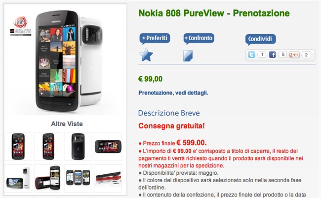 Al menos eso es lo que se interpreta en la captura de pantalla que les he mostrado, en la cual la propia marca Nokia en Italia anuncia su llegada al país de la bota. Y precisamente los datos que ven en ella ya les dan la idea del precio que nos esperábamos, el cual, si le quitamos la cámara que equipa el terminal nos parece excesivo, ya que el PureView no ofrece características de alta gama como la competencia, pero si quieren reservar puede hacerlo por 99 euros que se le descontarán del precio final.